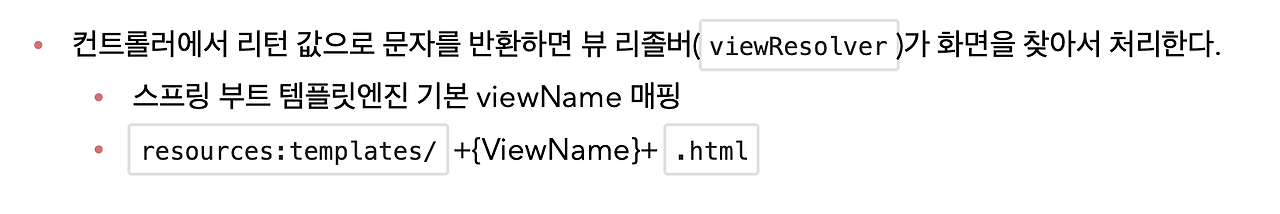 컨트롤러에서 return 값으로 문자를 반환하면 viewResolver가 화면을 찾아서 처리를 해준다.
