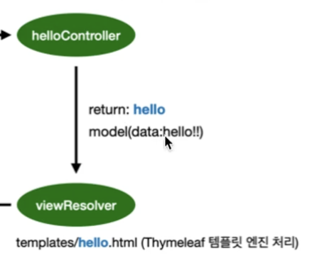 스프링(viewResolver)이 hello.html을 찾아서, 템플릿 엔진이 처리해준다.