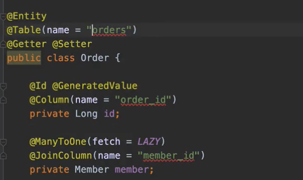 여러분이 이렇게 직접 적으신 거에도 JPA에서는 지금 orders 라고 적었지만, 앞에 xx_orders 라고 전사 표준어가 앞에 xx를 무조건 붙여야 돼! 라고 한다거나, 아니면 모든 테이블 명에는 프로젝트 이름을 적어야 돼! 라고 해서 jpashop_orders 라고 한다거나 하면, 모든 테이블마다 직접 해주기는 좀 그러니까 naming.physical-strategy를 해주시면 됩니다.
