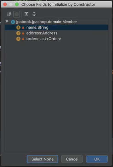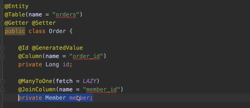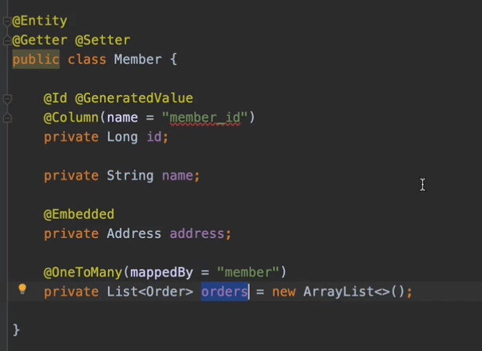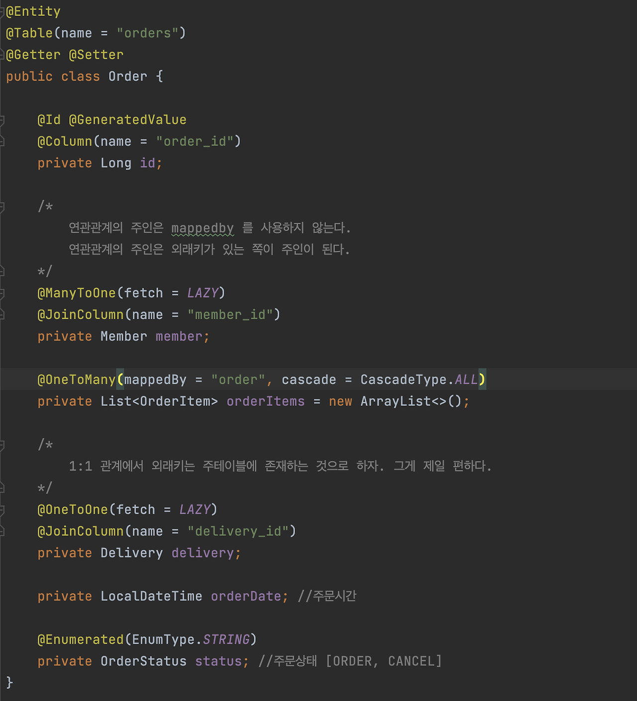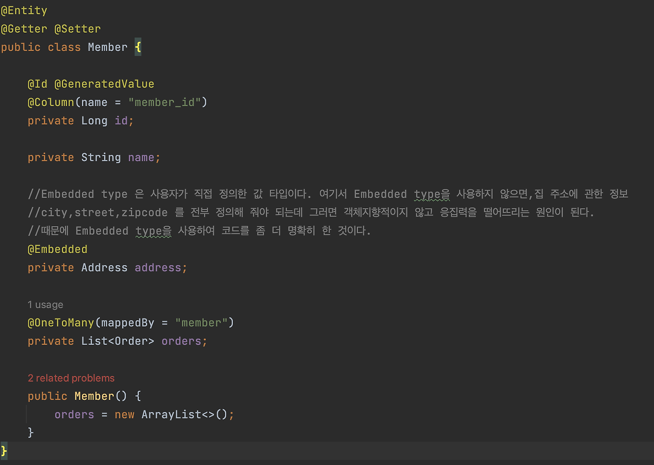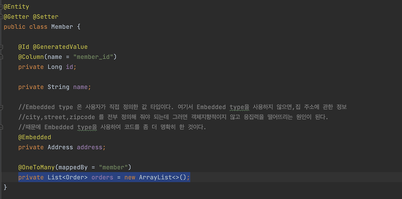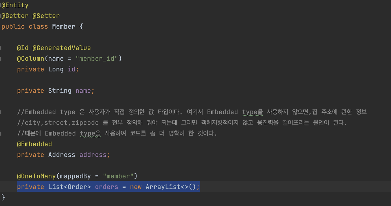 물론 얘가 연관관계의 주인이니까 db에 저장하는건 여기 Order.member에만 있으면 되는데, 그래도 로직을 태울 때 왔다갔다 하려면 이게 있어야 된다고요.