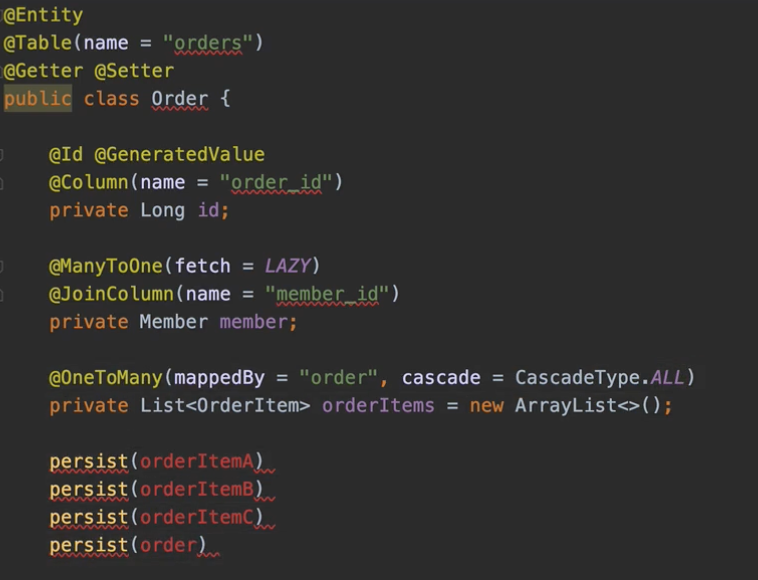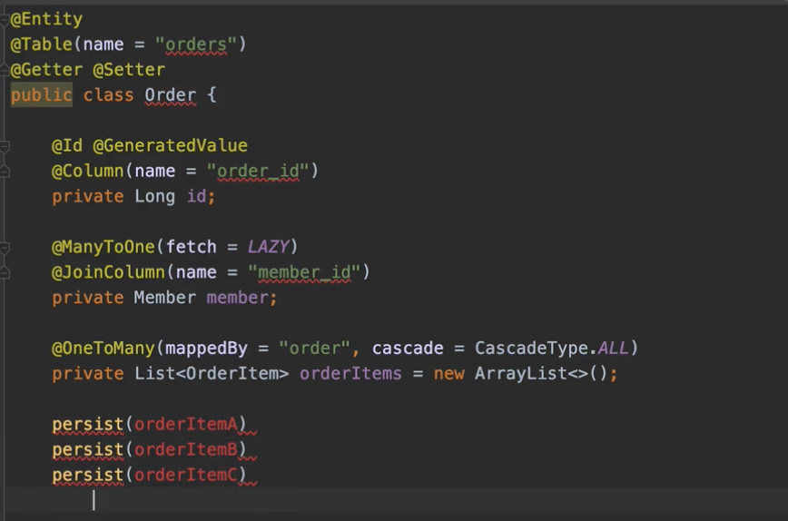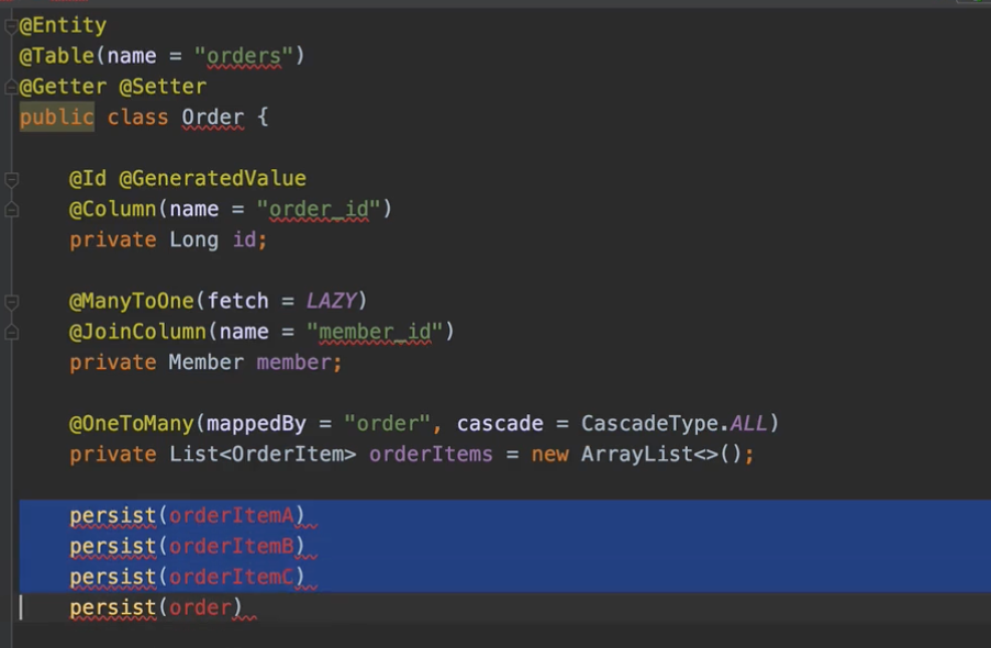 위의 코드는 지워도 됩니다. 그러니까 cascade를 하고 안하고 차이가 있죠. order를 persist 하면 cascade는 persist를 전파하거든요. 그래서 이 order item collection에 있는 A, B, C를 collection에 담아놨으면 얘네를 다 persist를 같이 해줍니다. CascadeType을 All로 해놨기 때문에 delete할 때도 같이 다 지워버립니다.