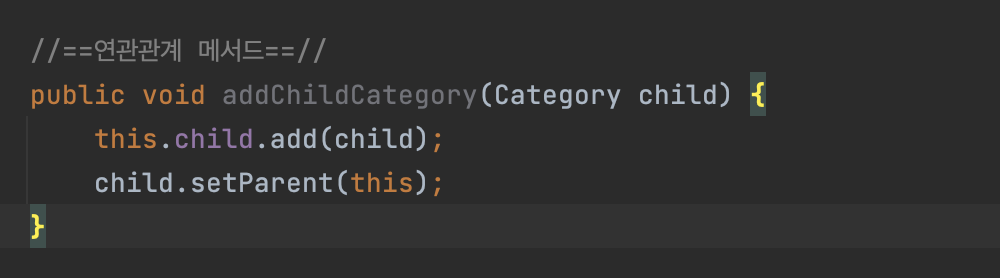 얘는 addChildCategory인데 Category가 셀프로 들어가죠. 얘도 양방향이죠. child를 집어넣으면 양쪽이 다 들어가야 돼요. 부모에도 들어가고 자식에도 들어가야 돼요. 부모 컬렉션에도 child가 들어가야 되고, 반대로 자식에서도 부모가 누군지를 바로 이렇게 this로 넣어주시면 됩니다.