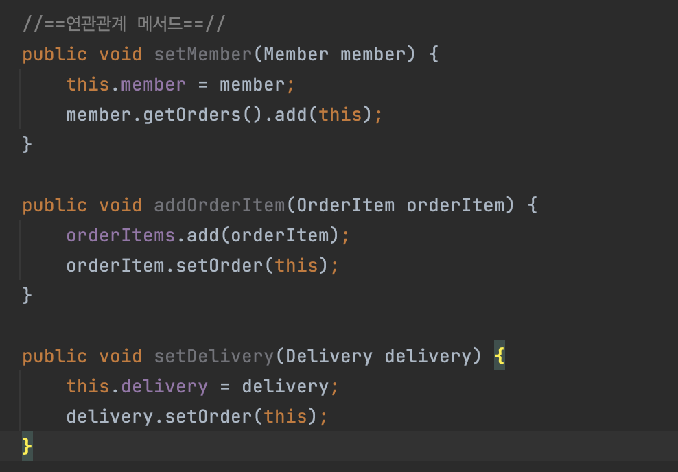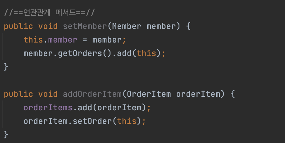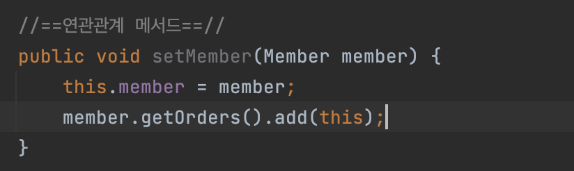 원래대로 하면 코드가 이런 식으로 뭔가 비즈니스 로직에서 이렇게 해야 되겠죠. 그런데 문제는 member에 order를 넣는 거나, order에 member를 넣는 거나 둘 중에 하나를 깜빡할 수 있잖아요.