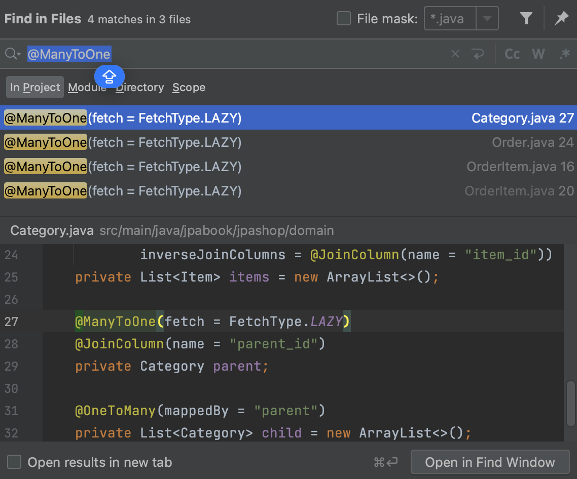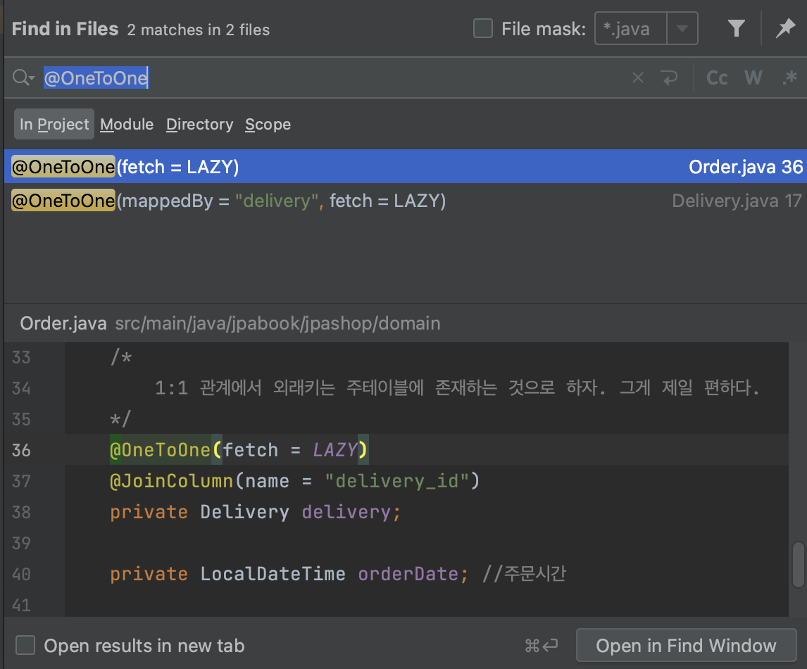 그러면 이제 @OneToOne, @ManyToOne을 다 찾아야겠죠. cmd + shift + F 해서,