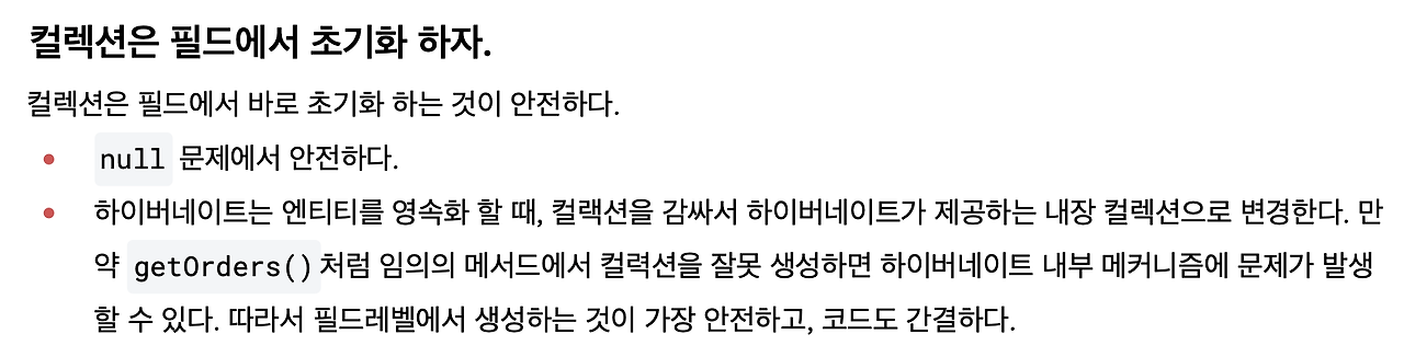 그래서 정리하면 컬렉션을 필드에서 바로 초기화 하는 것이 가장 좋습니다.