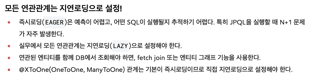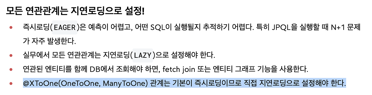 모든 연관관계는 지연로딩으로 설정해야 됩니다. 여러분 이거 엄청 중요합니다. 이거를 들으시면 수많은 장애를 극복하실 수가 있습니다. 이걸 거의 뭐 외우는 수준으로 쓰셔야 됩니다.