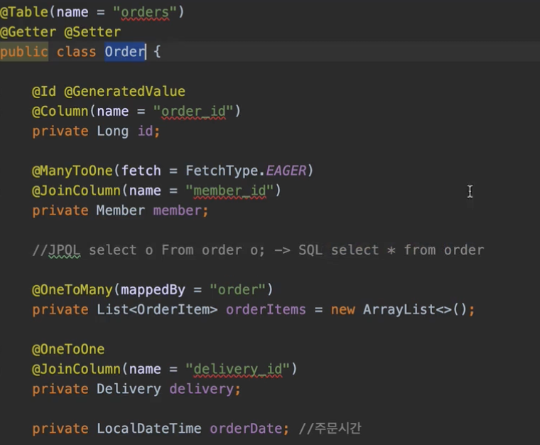 그런데 이제 JPQL이라 그러죠. JPA가 제공하는 쿼리를 가지고 select o from order o; 해가지고 가져와 버리면 문제가 뭐냐면, 이게 SQL로 그대로 번역이 돼요. EAGER 이런 거 다 무시하고 그냥 일단 얘가 그냥 select * from order 이런 식으로 번역이 된단 말이에요.
