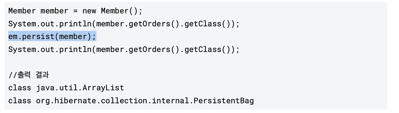 그래서 초기화를 필드에서 바로 하는 게 안전하고, Null 문제에서 안전해지죠. 그런데 그것보다는 사실은 문제가 있어요. Hibernate가 엔티티를 persist 하는 순간 컬렉션을 한번 감싸버려요. 뭐 감싸거나 하여튼 뭔가 지가 안에서 지지고 볶아요. 그래가지고 Hibernate가 제공하는 내장 컬렉션으로 변경이 돼버려요.