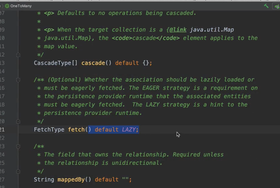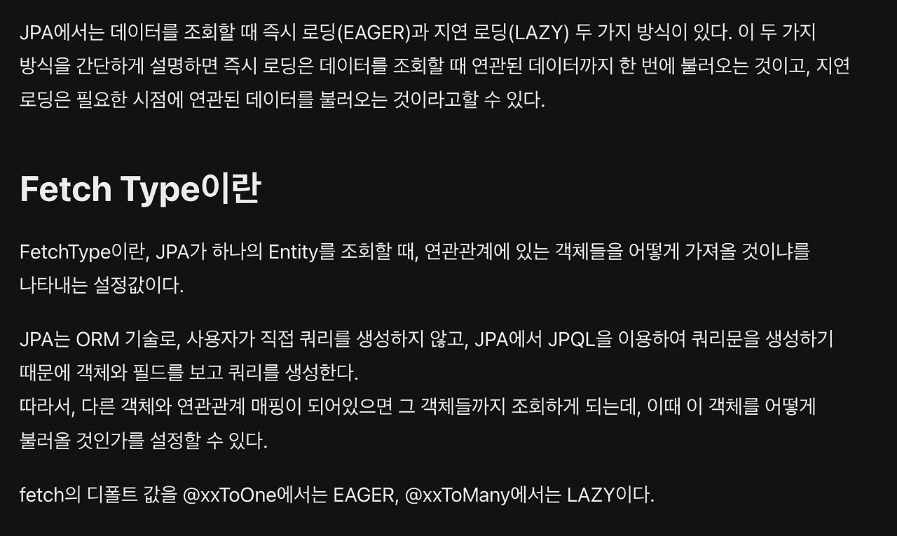 왜냐면 OneToMany는 기본이 LAZY란 말이에요. 두 개가 달라요. 다 LAZY 였으면 우리가 할 게 없을 텐데, 이게 지금 OneToOne, ManyToOne처럼 하나를 찌르는 애는 기본 fetch 전략 자체가 EAGER로 되어 있단 말이에요.