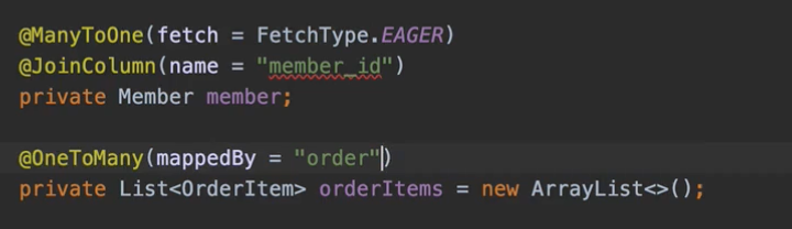 자 Member가 주문을 하면 여기 Order의 리스트에 넣어줘야 되겠죠. 왜냐면 양방향이니까 뭐 연관관계 주인 이런걸 다 떠나서 객체는 어쨌든 값을 양쪽에 다 넣어 줘야 되잖아요. 그래야 member.getOrder()에서 주문한 걸 찾을 수 있고 order.getMember() 해서 양방향이니까 객체적으로 왔다갔다 할 수 있겠죠? 그러면 양쪽에 값을 세팅해주는 게 제일 좋거든요.