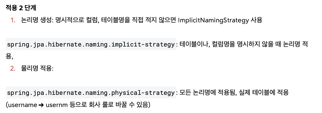 참고로 더 덧붙이자면 이게 논리명이 있고 물리명이 있거든요. 논리명이 뭐냐면 이제 명시적으로 테이블 컬럼명을 지정하지 않으면 어떻게 생성해줄지의 전략이구요. 물리명은 모든 논리명에 다 적용이 됩니다.