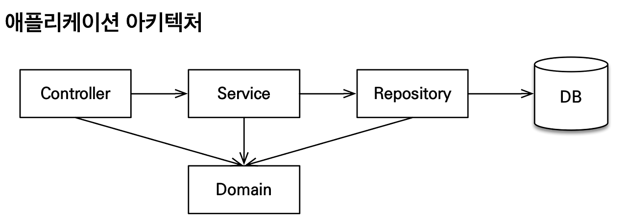 먼저 우리가 일반적으로 하는 그 계층형 아키텍처라는 걸 사용할 건데요. 컨트롤러, 서비스, 리포지토리는 딱 이 구조로 갈 겁니다. 리포지토리에서에 데이터베이스 접근하고, 각각은 이제 저희가 엔티티나 Value Object들을 설계해 놓은 그런 도메인을 다 참조하도록 설계를 할 겁니다.