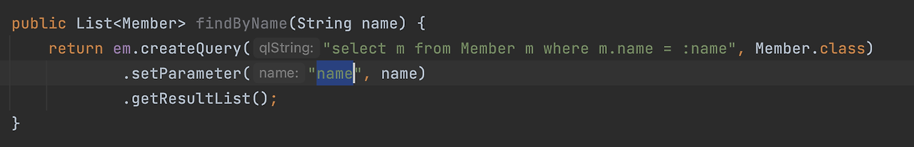 return em.createquery 한 다음에 jpql을 짜는데 where 문이 들어가는 거죠. m.name = :name 이렇게 하면 이게 parameter를 binding하는 거거든요. 그 다음 조회 타입은 Member.class 이렇게 하시고,