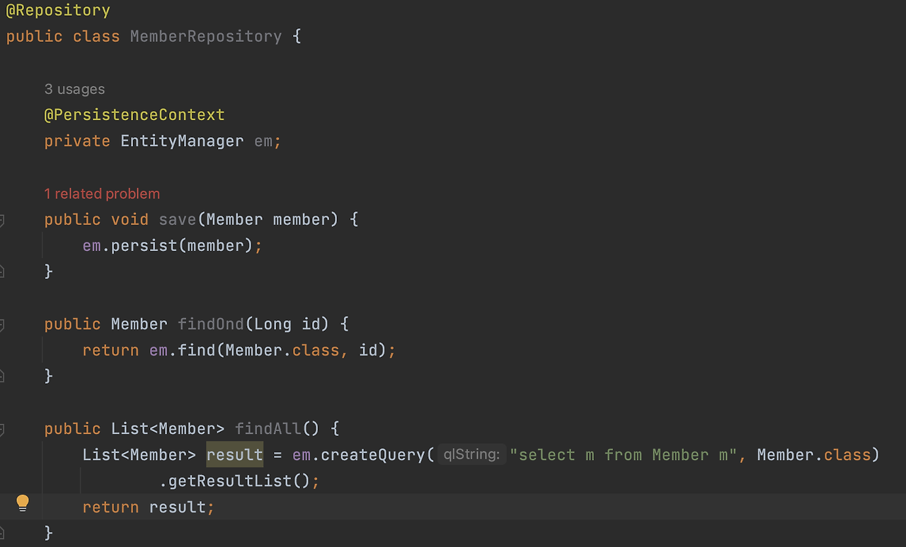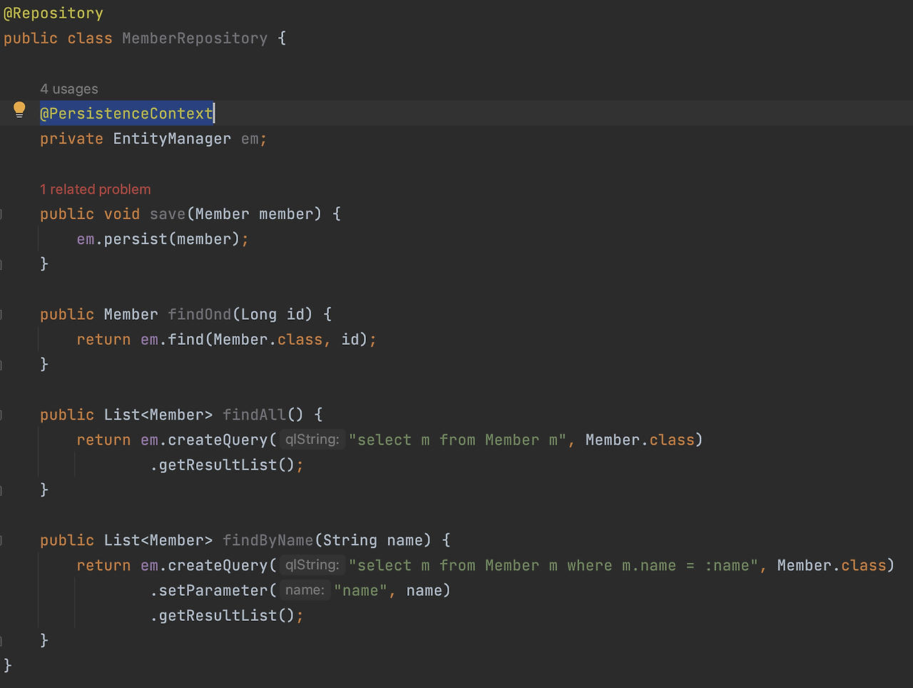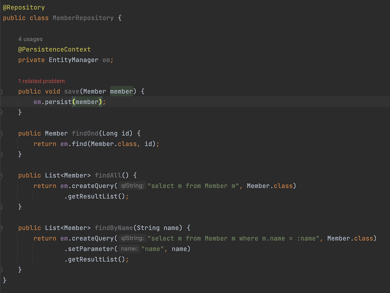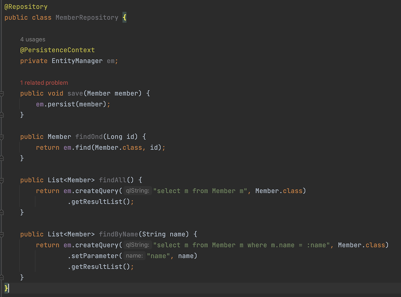 여기까지 하면 repository 코드가 완성이 됩니다. 기본적인 엔티티 매니저를 사용하는 것을 말씀드리면,