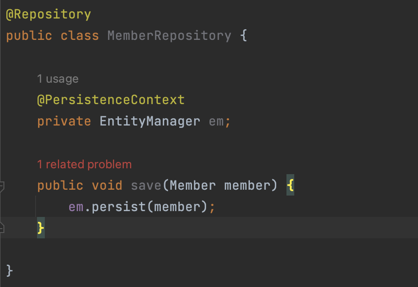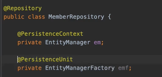 그 다음에 jpa를 어쨌든 저희가 사용하는 거기 때문에 jpa가 제공하는 표준 어노테이션인 @PersistenceContext 라는 걸 적어주면, 스프링이 entity manager를 만들어서 걔를 여기다가 주입해줍니다. injection 해주는 거죠. em이 있으면 저장 로직은 그냥 만들면 되죠.