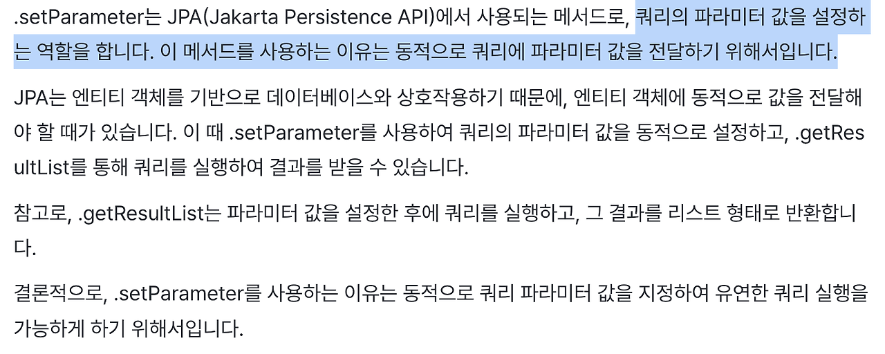 jpql 문에 있는 :name에 대응하는 name을 넘겨주기 위해서다.