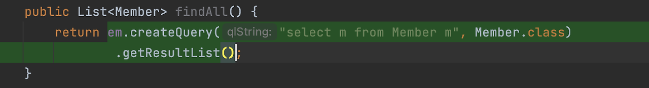 자 이 findAll()은 전부 다 찾아야 되거든요. 이때는 em.createQuery라고 해가지고 jpql을 작성해야 됩니다. 첫 번째 인자가 jpql을 쓰고, 두번째가 반환 타입을 넣으면 되거든요. 그 다음에 getResultList() 라고 해주시면,