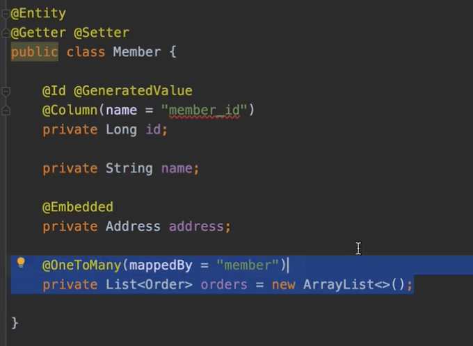 그 전에 저희가 만들었던 회원 엔티티 코드를 보겠습니다.