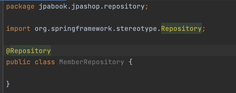 우선은 Spring를 사용하는 것이기 때문에 Spring에서 제공하는 repository annotation을 사용하면 얘가 이제 컴포넌트 스캔에 의해서 자동으로 Spring 빈으로 관리가 되게 되죠.
