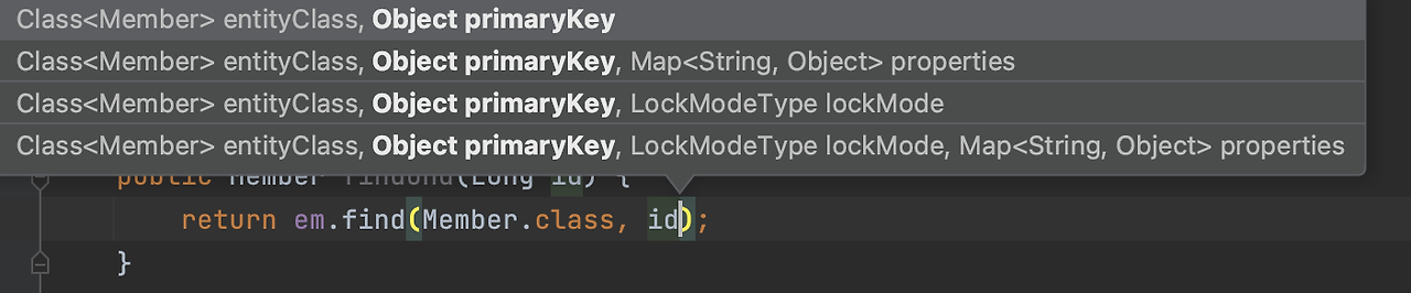 이렇게 하면 em.find 해서 jpa가 제공하는 find method을 가지고 Member.class 하고 이 id 값을 넘기면, findOne이 해당 멤버를 찾아서 반환해주게 됩니다.
