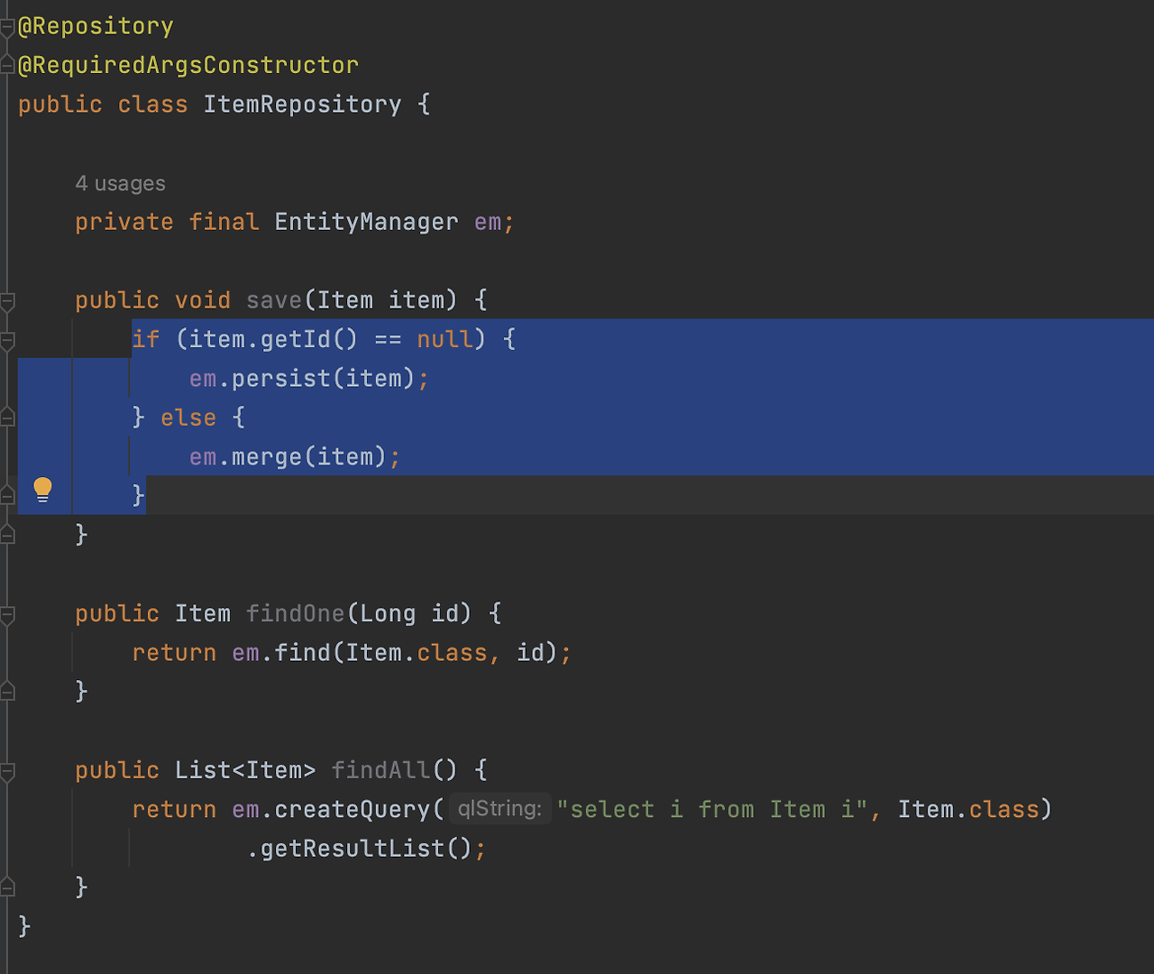 그 다음에 findAll() 같은 경우에는, 단 건 찾는 거야 저렇게 엔티티 메니저의 find를 쓰면 되지만 여러 개 찾는 것은 jpql을 작성해야 되죠.