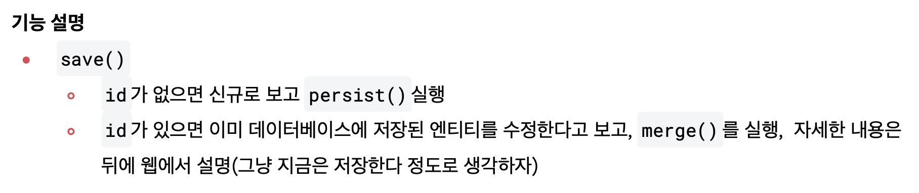 아까 설명드렸다시피, Id를 저장할 때 말씀드린대로 Id가 없으면 새 걸로 보고 persist로 호출하고 Id가 있으면 이미 JPA를 통해서 DB에 한번 들어간 거구나. 라고 가정을 하고 merge 라는 걸 써서 강제로 업데이트 하는 거라고 보시면 될 것 같구요. 이정도 설명드리면 되겠네요.