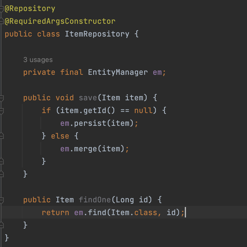 지금은 그냥 어떻게 생각하시면 되냐면 JPA를 잘 아시는 분들은 이거에 대해서 명확하게 아시겠지만, item은 JPA에 저장하기 전까지 id 값이 없거든요. Id 값이 없다는 거는 무슨 뜻이냐면, 완전히 새로 생성한 객체라는 거예요. 그래서 이거는 save를 호출하면 Id 값이 당연히 null일 거고 결국 em.persist로 item을 완전히 신규로 등록하는 거다. 라고 가정을 하시면 되고요. 만약에 '어? item에 id 값이 있네?' 이건 뭐냐면 이미 db에 등록된 걸 어디서 가져온 거예요. 그래서 여기서의 save, merge는 update 라고 이해해주시면 됩니다. 물론 진짜 업데이트는 아닌데 그거랑 비슷하다고 보시면 됩니다. 자세한 것은 뒤에 웹 어플리케이션을 개발하는 데서 설명해 드릴게요.
