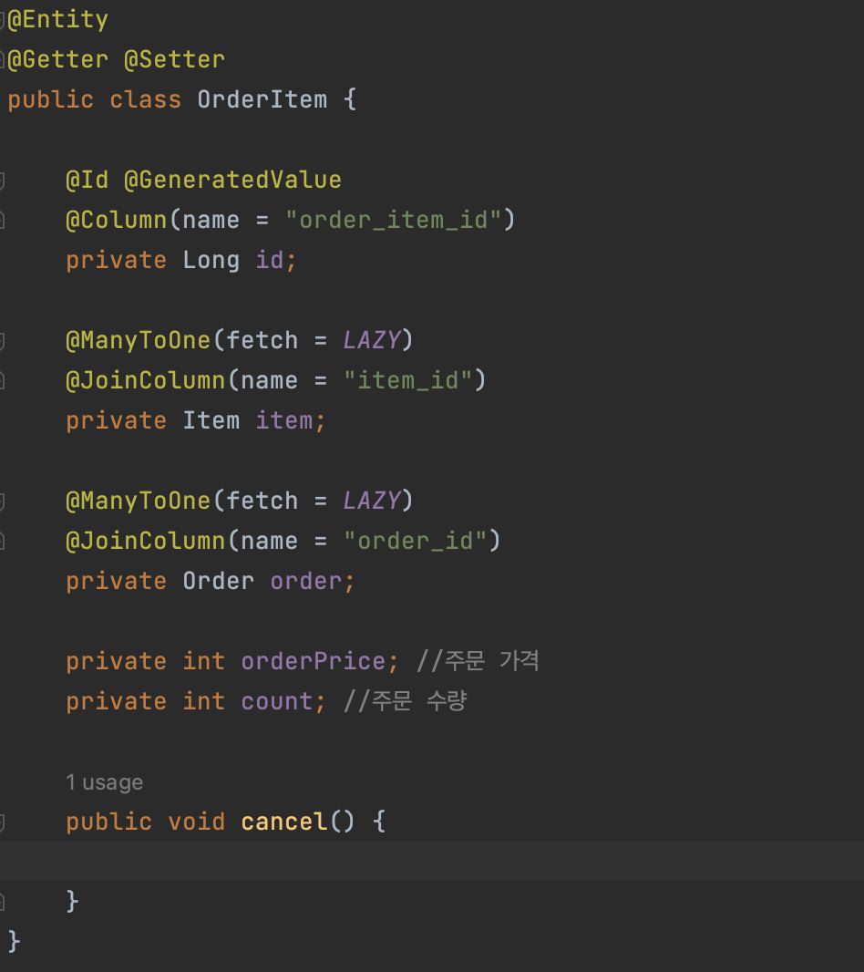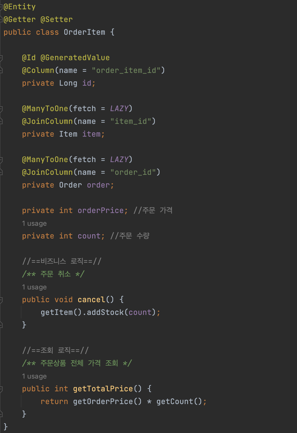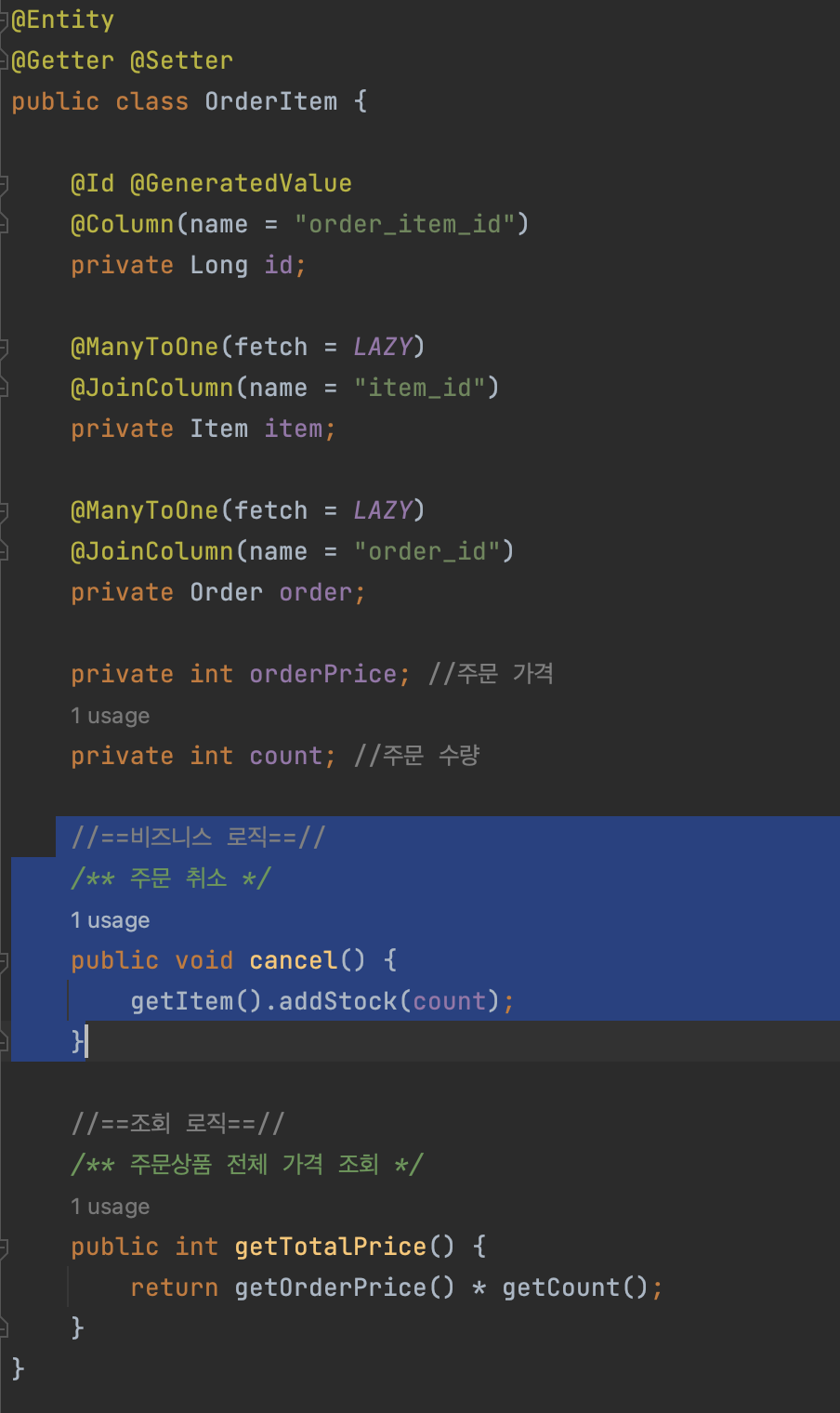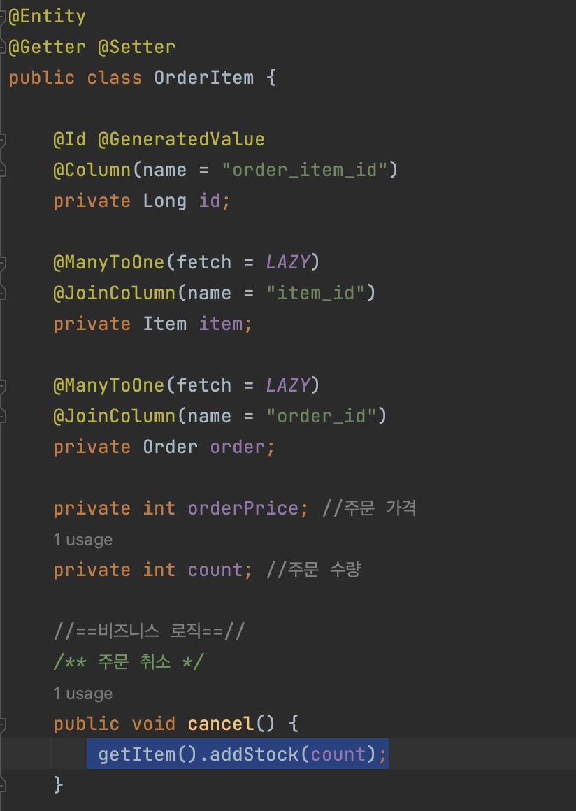 그럼 이제 OrderItem에도 비즈니스 로직 들어온 거란 말이에요. 그럼 한번 cancel 시 어떻게 해야 될까요?