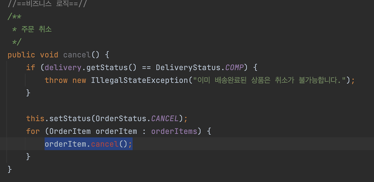 이 check 로직이 엔티티(Order 클래스) 안에 있죠. 그 다음에 상태를 바꿔주고 루프를 돌면서 그 orderItem에 대해서 cancel()을 치면,