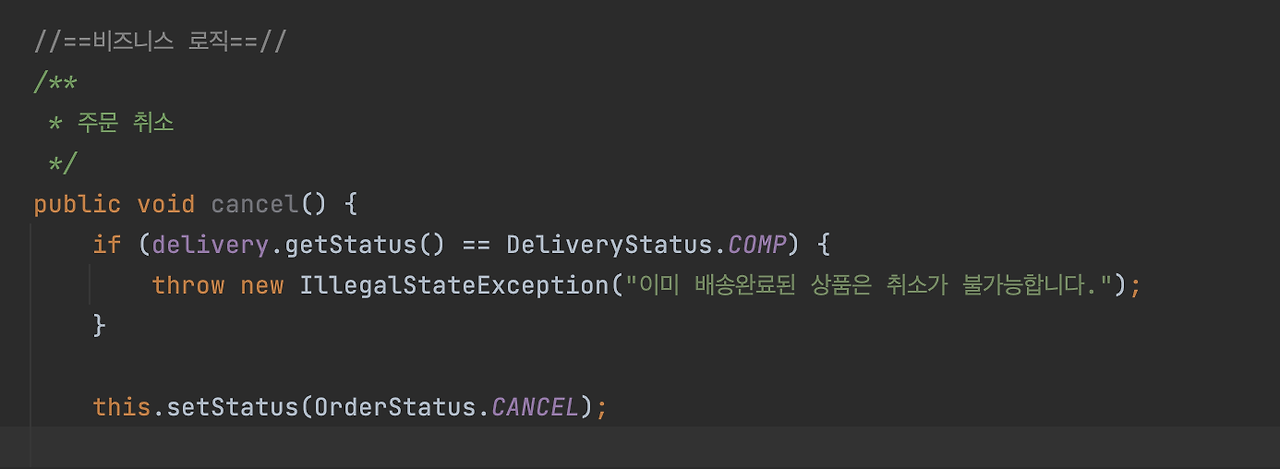 그 다음에 this.setStatus를 해서, 위의 validation 로직을 통과하면 order의 상태를 cancel로 바꿔주면 됩니다.