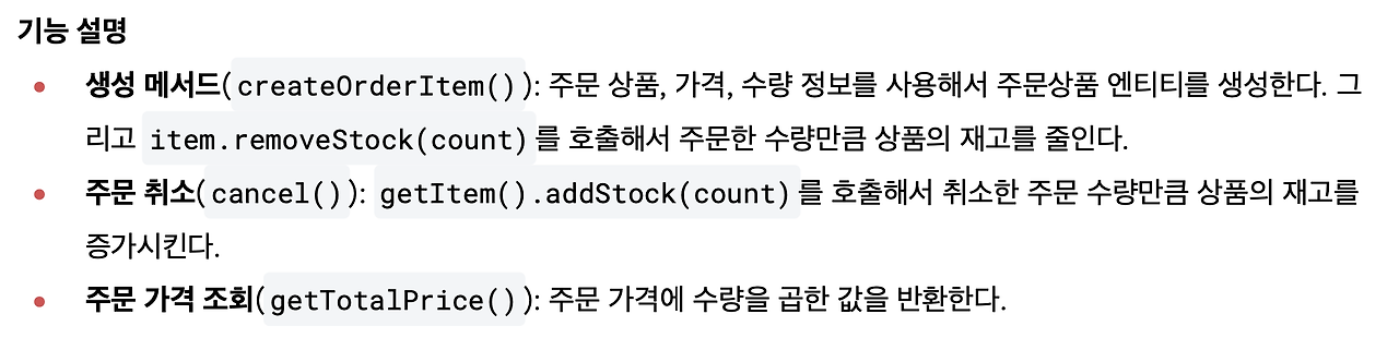 그리고 지금 하나가 빠졌는데 OrderItem에 생성자 메서드를 하나 만들어 줄거에요. OrderItem도 이제 생성하는게 단순하지 않거든요.