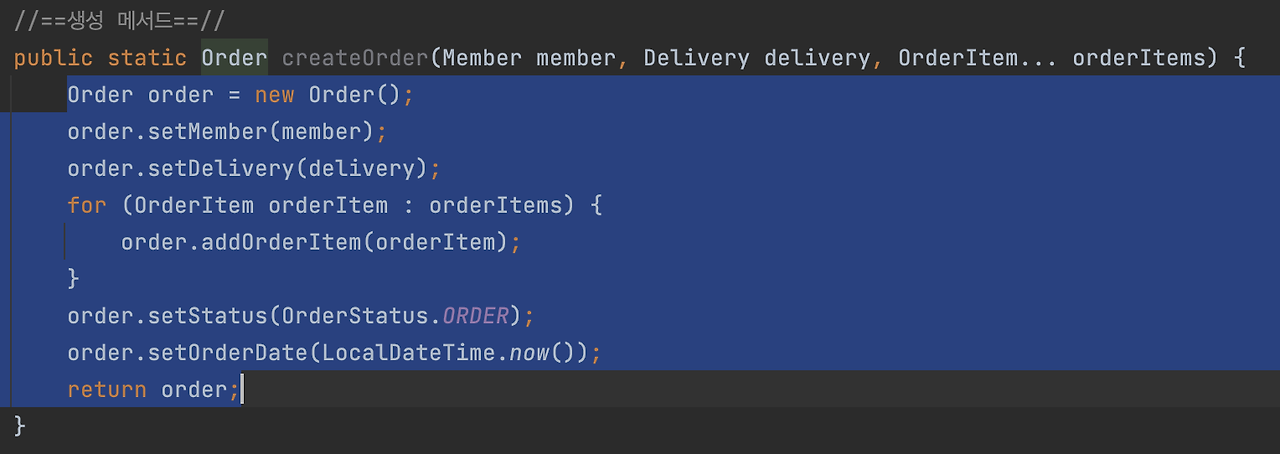 이 메서드가 기본적으로 밖에서 Order를 new 해서 값을 셋셋셋 하는 방식이 아니라, 생성을 할 때부터 아예 그냥 createOrder를 무조건 호출해야 돼요. 그래서 값을 Member, Delivery, OrderItem을 쭉쭉쭉 넣어 가지고 이 생성 메서드 내에서 완결을 시킵니다.