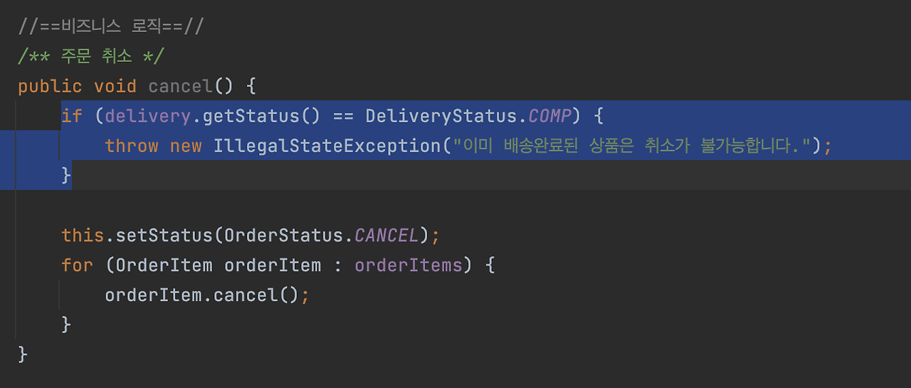 throw 해서 exception 해가지고 이미 배송 완료된 상품은 취소가 불가능합니다. 라고 터트리면 됩니다. 이렇게 validation 로직을 넣었구요.