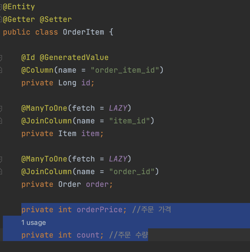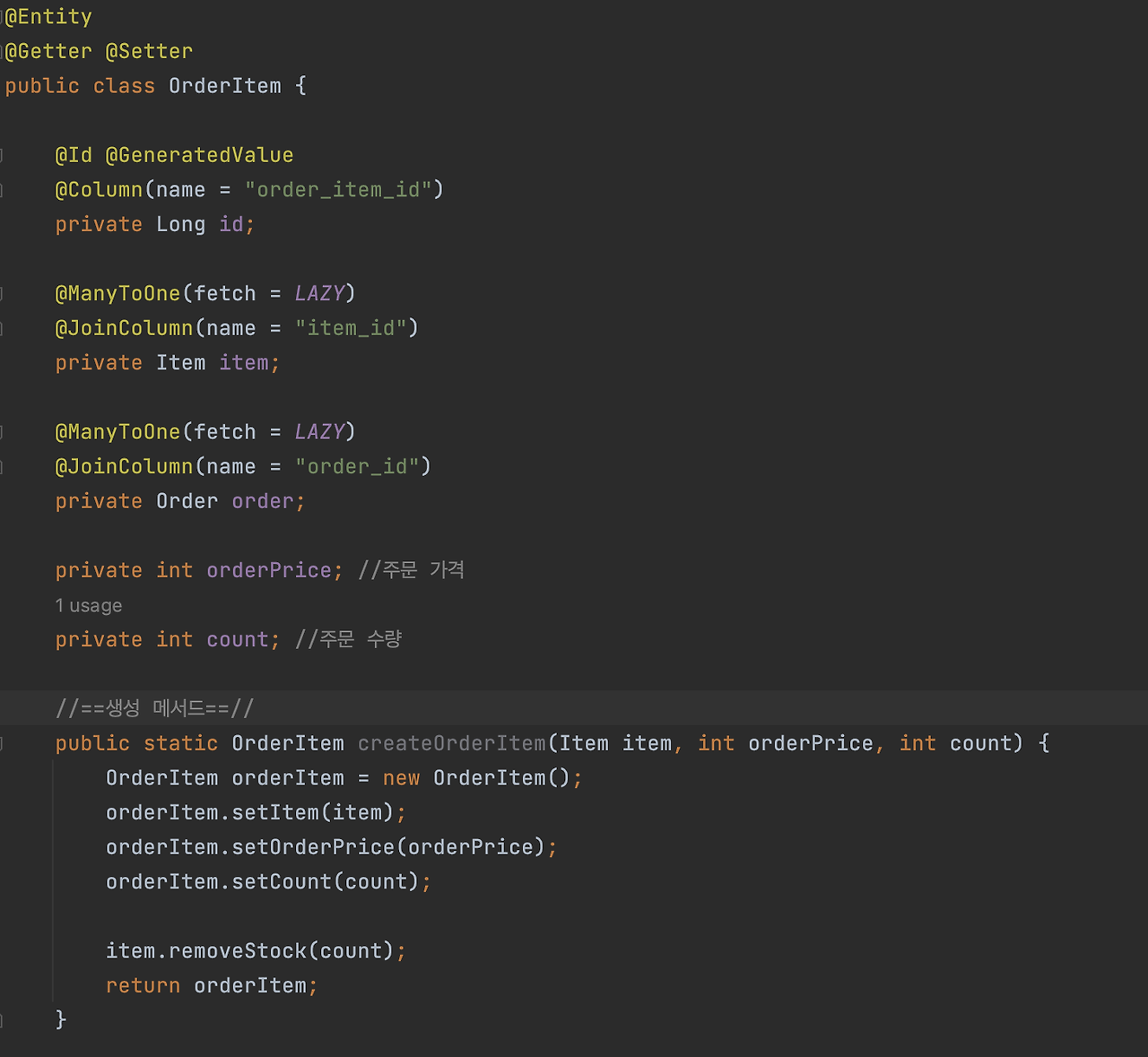 이 생성자 메서드에는 세팅해줄 만한 게 필수로 Item이랑 OrderPrice랑 Count가 있겠죠. Order 같은 경우는 주문 상품을 만들 때 굳이 어떤 주문인지 필수로 세팅해야하는 것은 아닙니다. 일일히 세팅하기 귀찮겠죠.