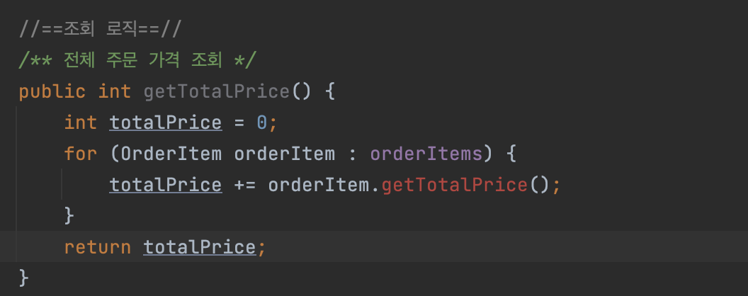 자 이렇게 totalPrice를 0으로 초기화 해놓고 orderItems 루프를 돌면서 orderItem 에 있는 totalPrice를 가져옵니다.
