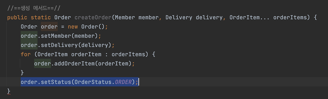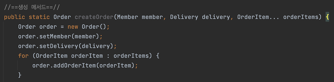 public static로 만들어 가지고 createOrder 한 다음에 주문하려면 멤버가 있어야 되겠죠. 그리고 delivery, 배송 정보가 있어야 되고 그 다음에 orderItem을 list로 넘기면 되는데 여러 개 할 수 있으니까 ... 문법으로 넘겼습니다. 이렇게 하면 여러 개를 넘길 수 있겠죠.