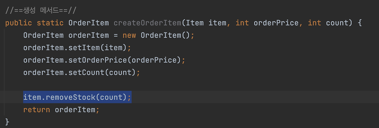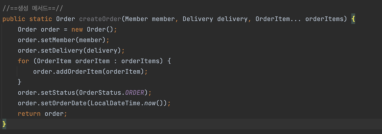 사실 참고로 여기 있는 생성 메소드는 실무에서 훨씬 복잡하겠죠. 여기서 넘어오는 OrderItem도 사실 막 이렇게 넘어오는 게 아니라, 뭔가 파라미터나 DTO가 막 넘어오면서 더 복잡하게 들어오고, 그냥 이 생성자 메서드 안에서도 OrderItem을 아예 생성해서 넣을 수도 있고요. 그게 이제 상황에 따라서는 더 깔끔한 방법이 됩니다.
