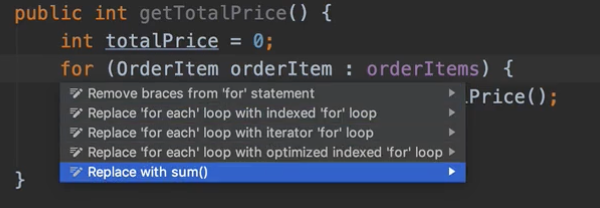 이렇게 하면 totalPrice가 계산이 됩니다. 물론 좀 더 깔끔하게 할 수 있겠죠. java 스트림이나 람다 같은 거를 활용하시면 되게 깔끔하게 작성할 수 있습니다. option + enter 누르시면,