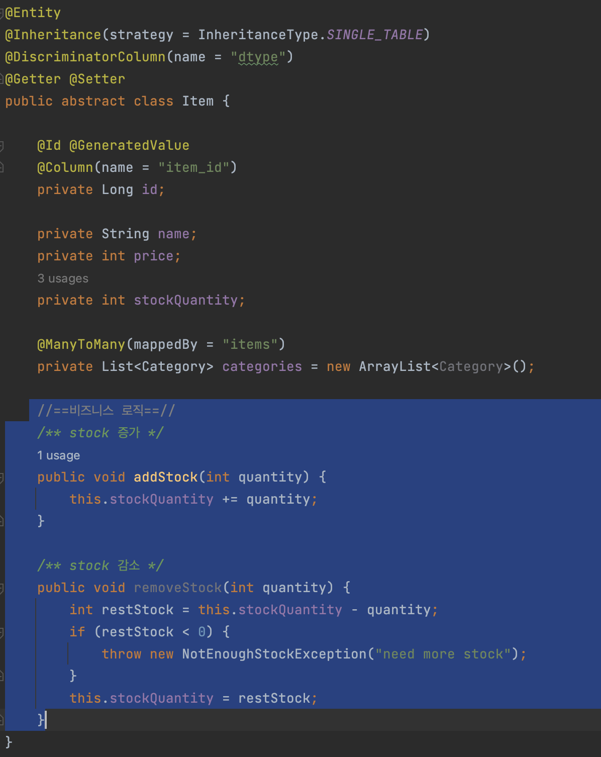 orderItem에 있는 cancel()로직이 Item의 재고를 원복 시켜주죠. 그렇게 해서 cancel의 addStock을 가보면,