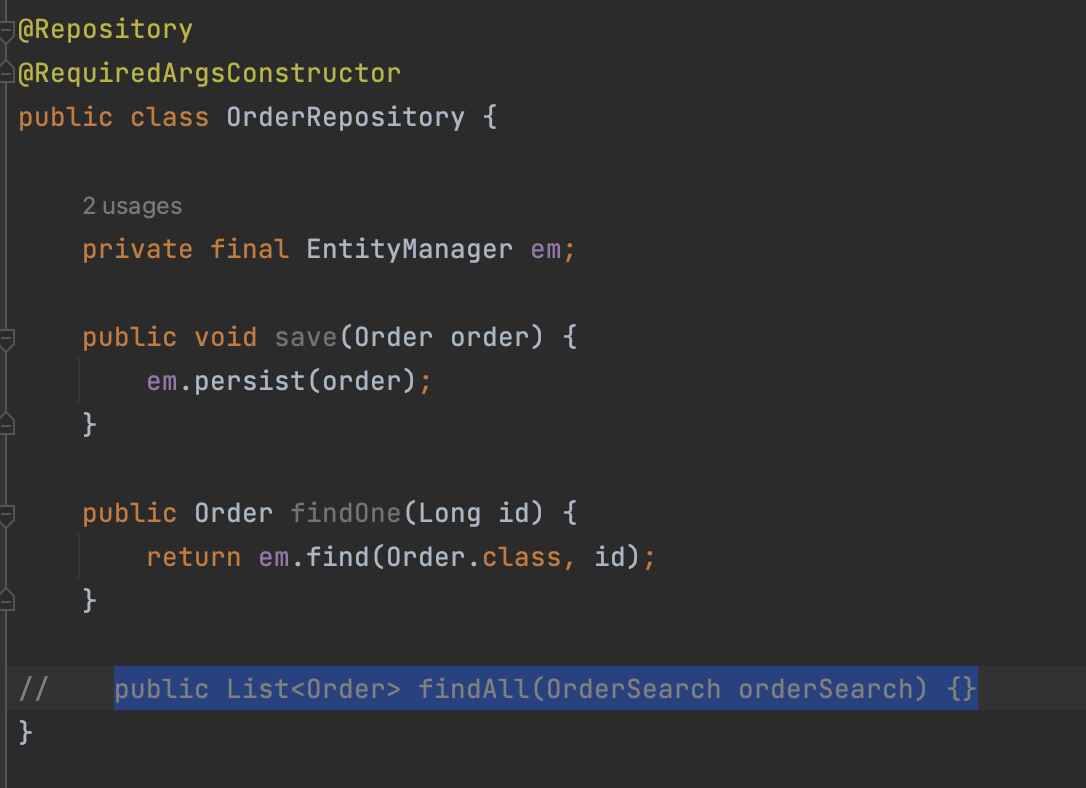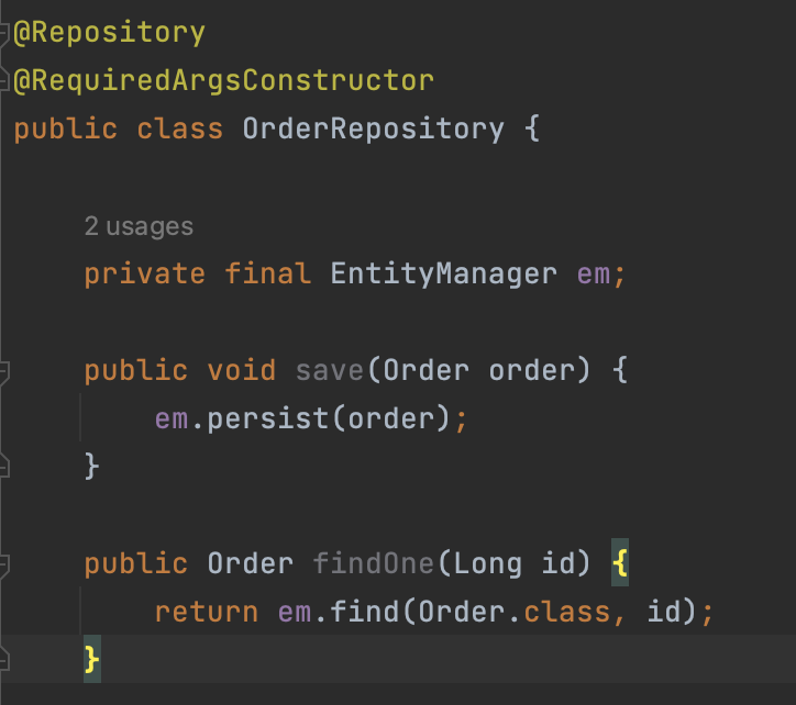 findOne 해가지고 id를 넣어서 반환 할 때 em.find로 Order.class랑 id 값을 넣어주고 return 하면 됩니다.