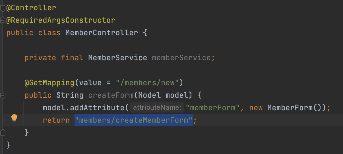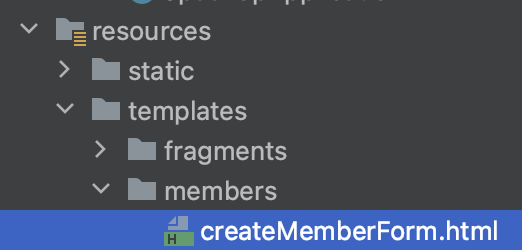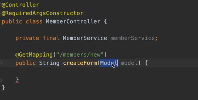 그러니까 /members/new로 GET 방식으로 오면, 이 컨트롤러를 타서 저 createMemberForm이 열리는 겁니다.