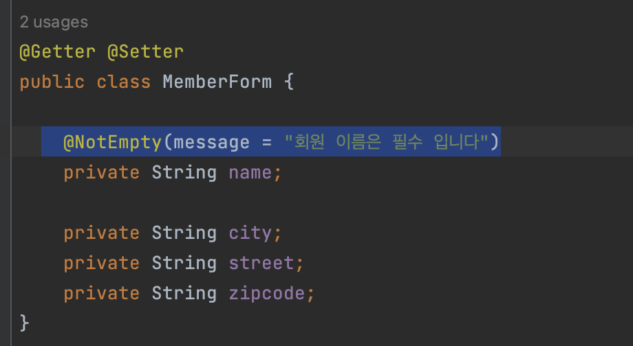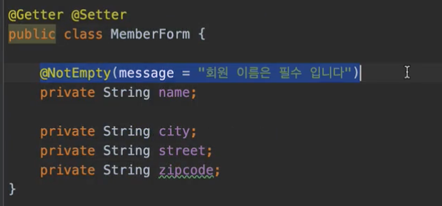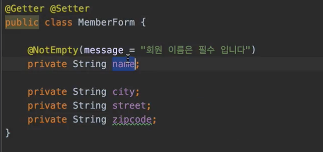 @NotEmpty 라고 jakarta.validation 라는 게 있어요. 뭐냐면 name은 필수로 받을 거고 나머지는 필수가 아닌 거에요. 이렇게 해서 회원 이름은 필수입니다. 이렇게 해놓으면 jakarta.validation을 통해서 스프링이 MemberForm을 validation 해줍니다. name에 값이 비어 있으면 뭔가 오류가 난다는 거겠죠.