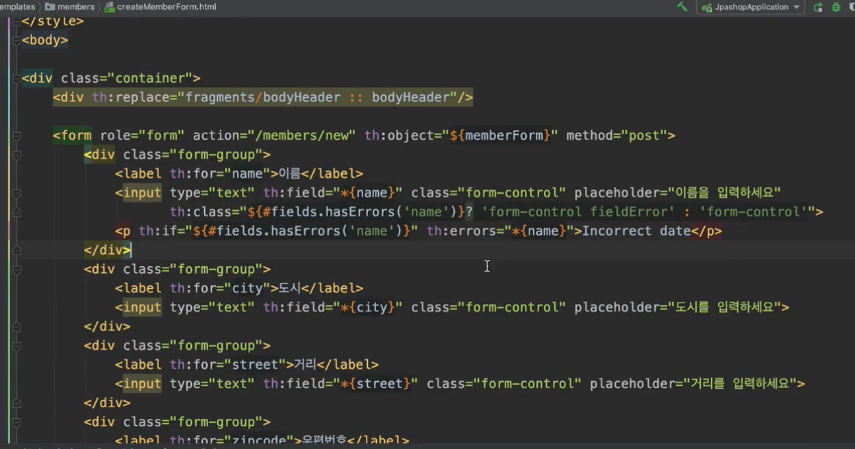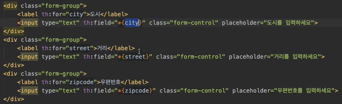 그럼 여기가 포인트인데 자 input type은 텍스트인데 field는 name이죠. city, street, zipcode를 다시 여기서 다 뿌려요. th:field="*{name}"인데,