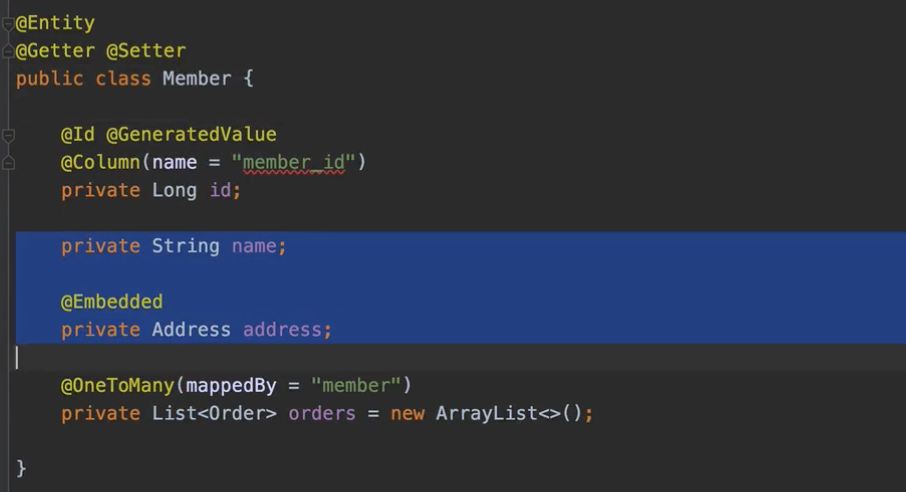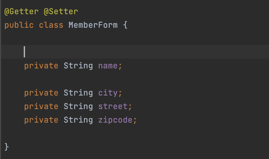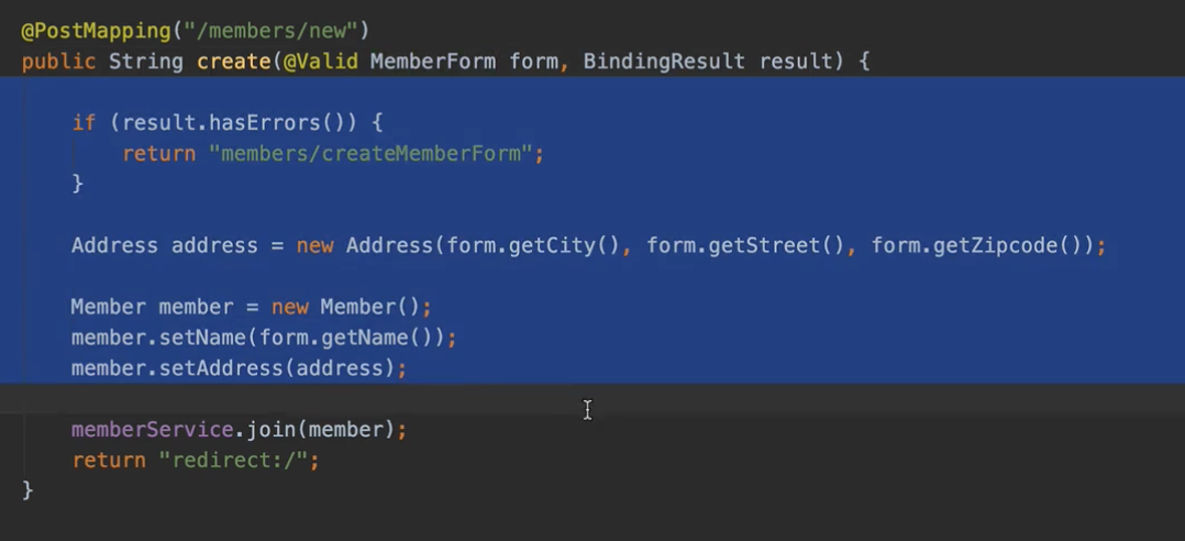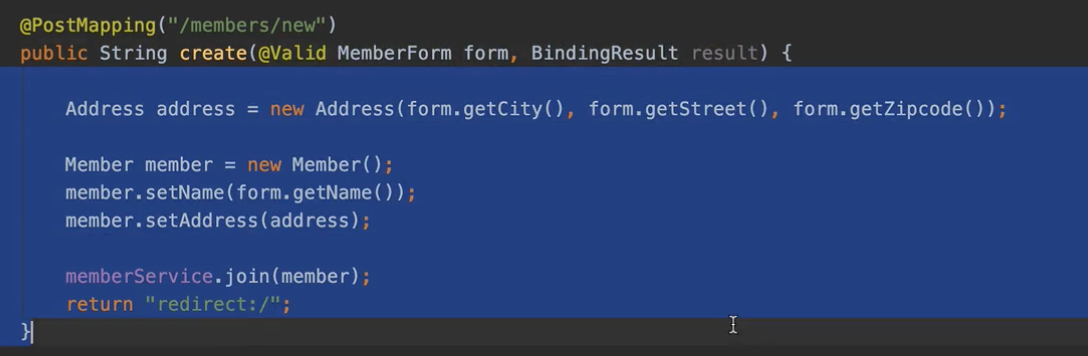 그 다음에 member.setname 해서 form에서 name 가져오면 되죠. 그리고 member.setaddress를 해서 위에서 만든 address를 넣으면 되겠죠.