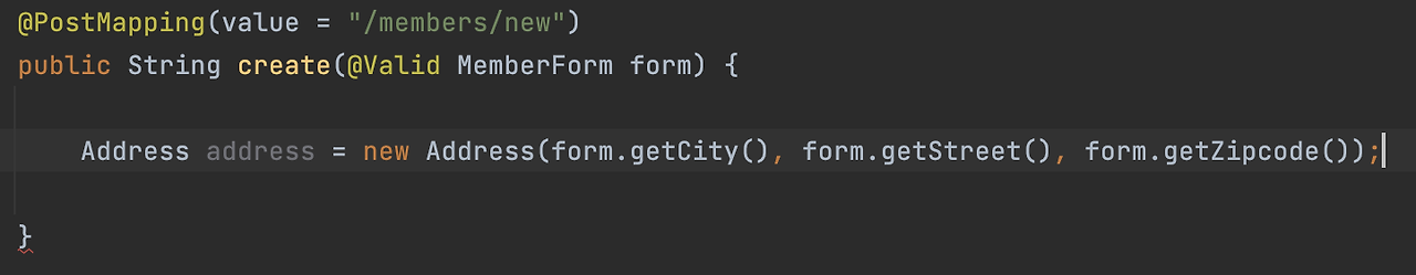 자 그 다음에 이제 데이터를 가지고 new address를 만들 거에요. 이것도 아마 되게 편하게 하는 방법이 있을 텐데 저는 그냥 이렇게 하겠습니다. form에 있는 걸 꺼내서 변환하는 걸 보여드리려고 이렇게 예시를 만들었구요. form에서 꺼내서 city, street, zipcode를 가지고 우리의 value object인 address를 만들었죠.