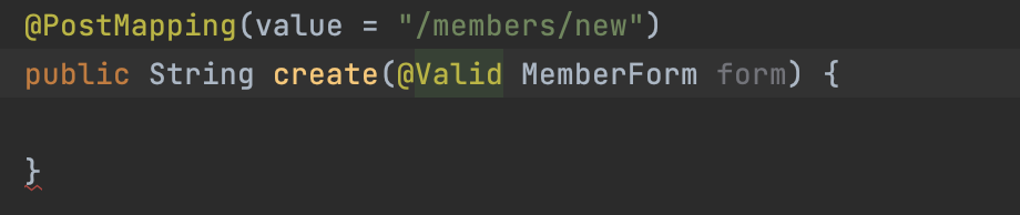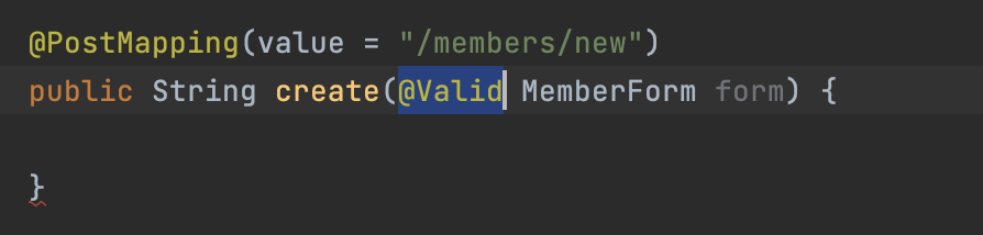 그러면 여기서 @Valid라고 적어줍니다. 이렇게 하면 @Valid 라는 jakarta의 표준 어노테이션을 쓸 수 있거든요.