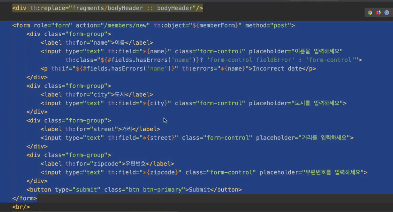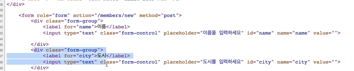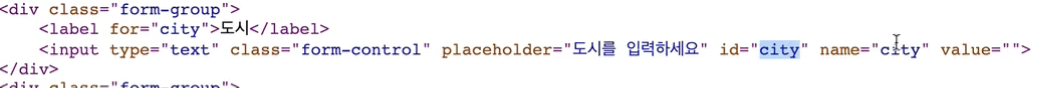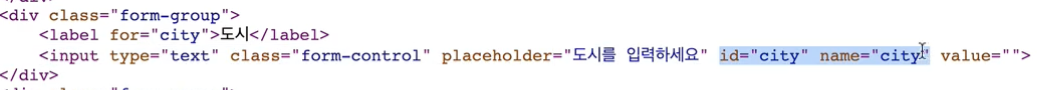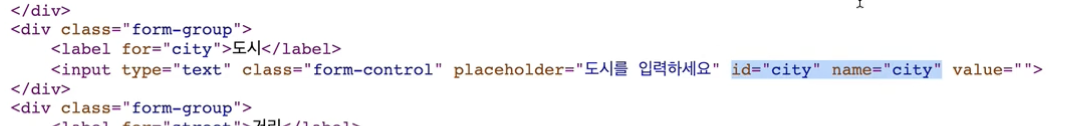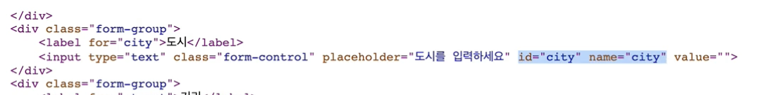이 id랑 name 있죠. 보통 form을 만들 때 id랑 name을 넣어주거든요. 관례상 id랑 name을 둘 다 똑같은걸 보통 적는단 말이에요. 그런데 약간 중복이잖아요. "city" 이걸 두 번 작업을 해야 되니까 Thymeleaf에서 뭐가 있냐면,