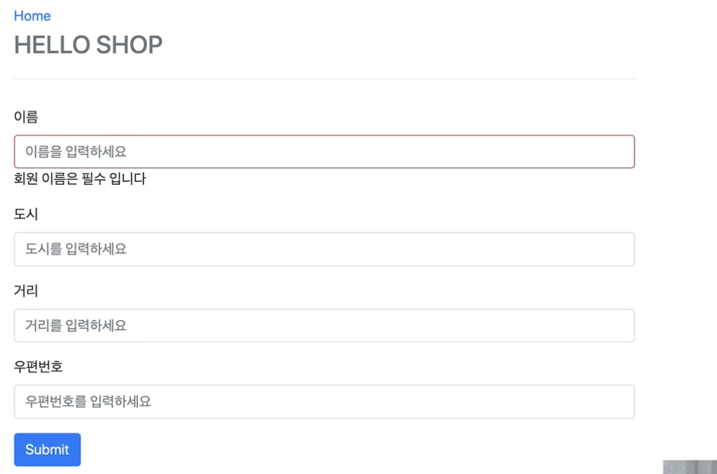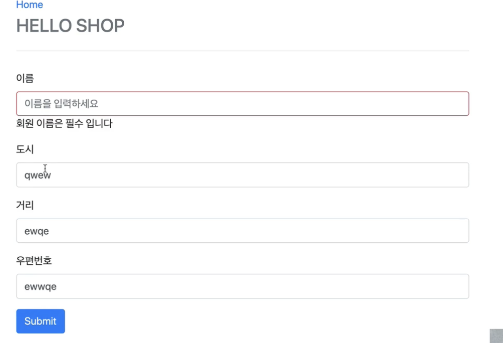 이렇게 코드를 짜게 되면 이 form에서 뭔가 오류가 있잖아요. 그럼 원래는 컨트롤러에서 코드가 안 넘어가고 그 오류가 튕겨버리거든요.