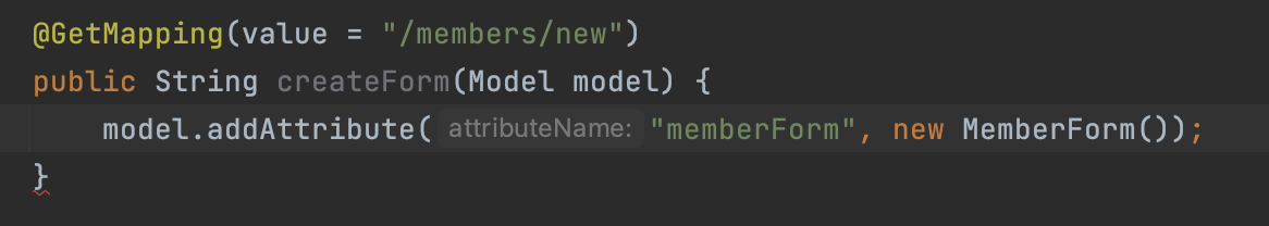 여기 model에다가 제가 addAttribute 해서 MemberForm이라고 하면, 컨트롤러에서 View로 넘어갈 때 이 파라미터에 들어가 있는 데이터를 실어서 넘깁니다.