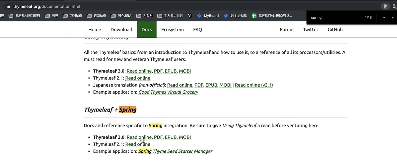 그 다음에 타임리프에 대한 것도 Documents에 가셔서 Spring으로 검색하면 타임리프 + 스프링이 있거든요. 메뉴얼이 엄청 잘 돼 있어서 읽어보시면 여러분들이 원하는 웹페이지가 정말 친절하게 나와있어요.
